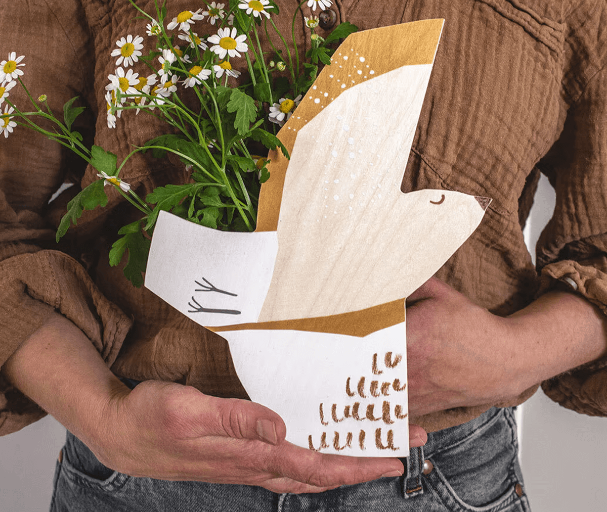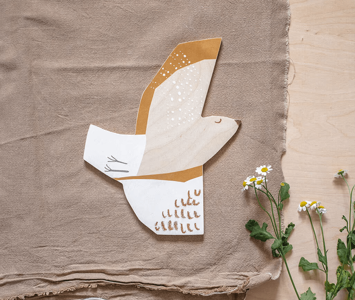 - signiertes Kunstwerk auf Birkenholz, Farben: natur-weiß-messing